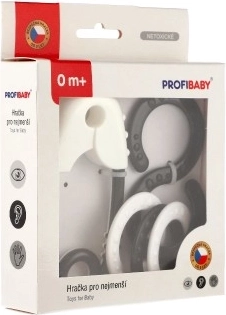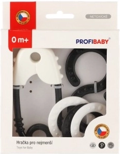 Sæt af sorte og hvide rasler, ideel til stimulering af syn og hørelse hos små børn. Perfekt størrelse til børns hænder.