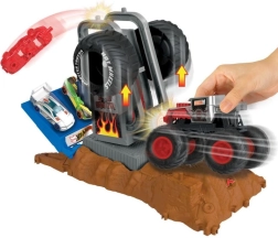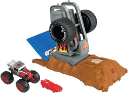 Den indbyggede affyringsmekanisme sender en bil eller monstertruck ud i et stejlt hop. Børn trykker på håndtaget og får øjeblikkelig action.