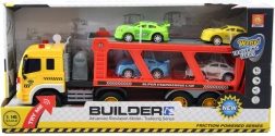 I pakken er der 4 plastikbiler, som nemt kan lastes på og aflæsses. Takket være skalaen 1:16 og dimensionerne på ca. 40 × 12 cm er lastbilen både robust og let at håndtere for små børnehænder.