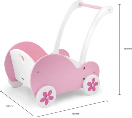 Det rosa-hvide design og blomsterdetaljer på hjulene giver vognen et attraktivt udseende, der stimulerer barnets fantasi.
