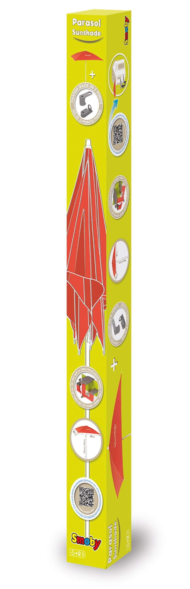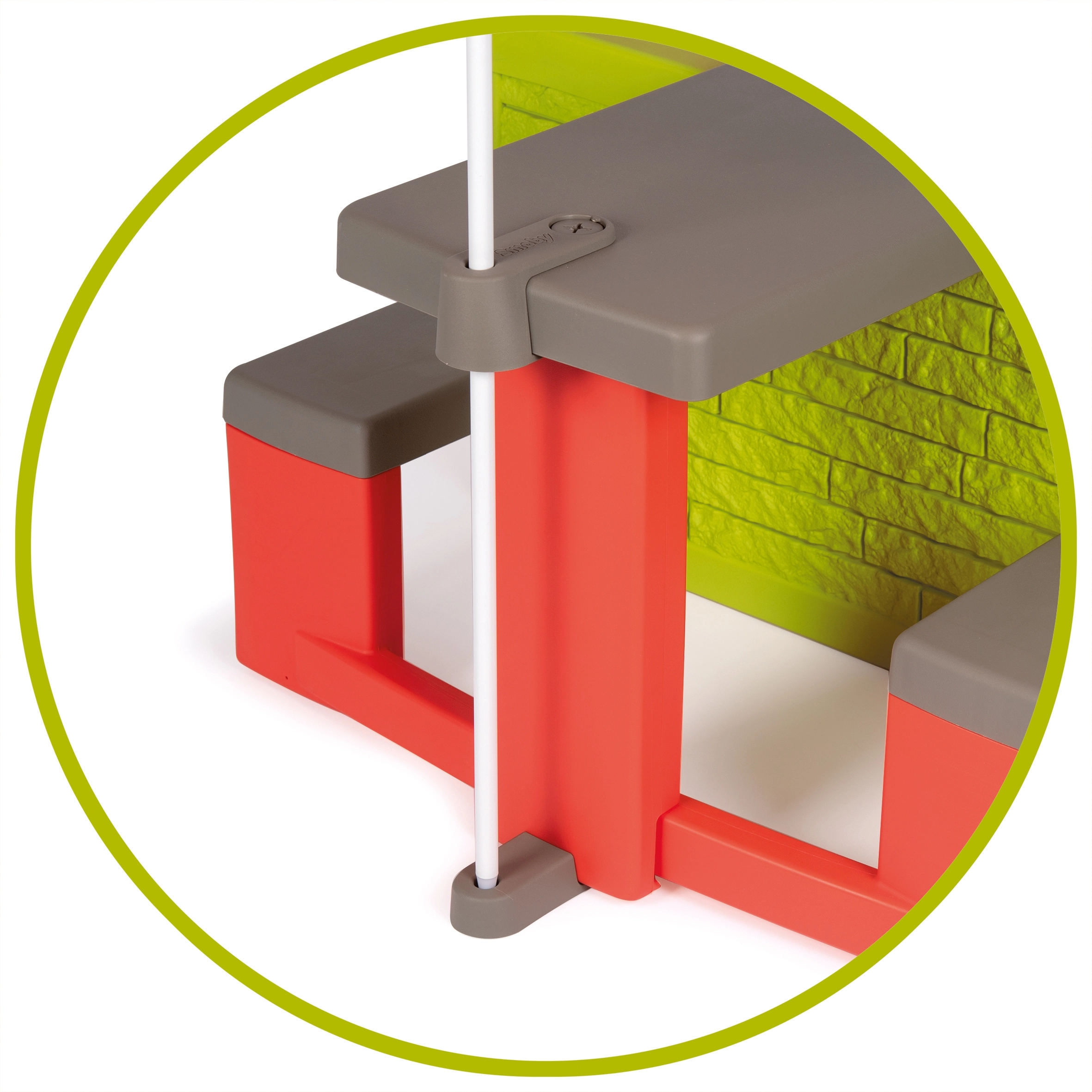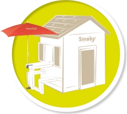 Parasol til beskyttelse mod sol og regn, fastgjort til havebordet SMOBY cottage.