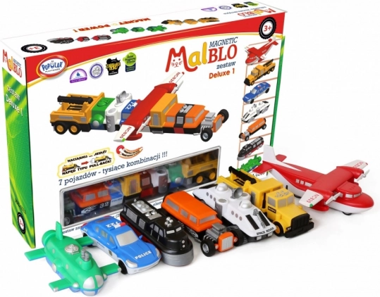 Byggesættet MalBlo MAGNETIC Deluxe er et smart legetøj til små konstruktører. 21 elementer i pakken (7 færdige køretøjer) gør det muligt at samle mere end 1000 forskellige kombinationer – fra biler og lasttrækkere til fly og fremtidens maskiner. Delene har den ideelle magnetiske og mekaniske koblingsstyrke, så de er lette at betjene og samtidig holder godt sammen.