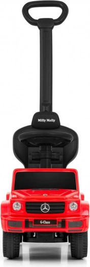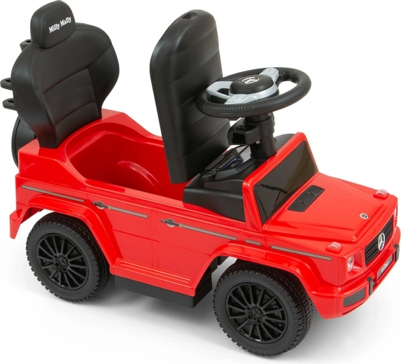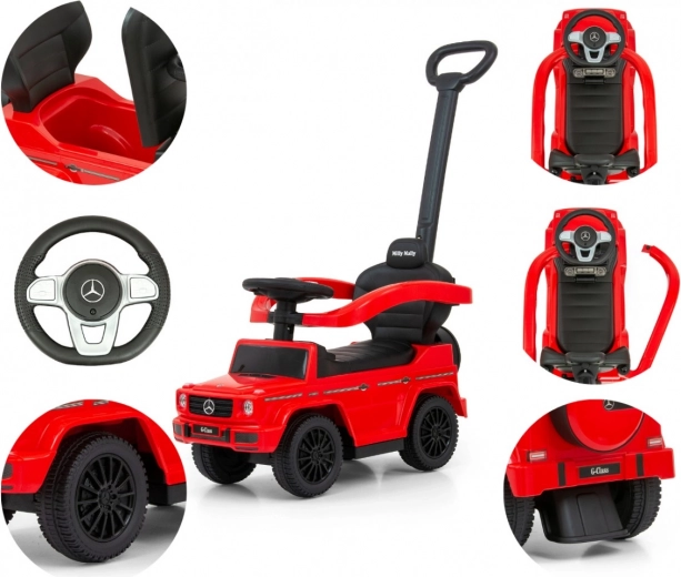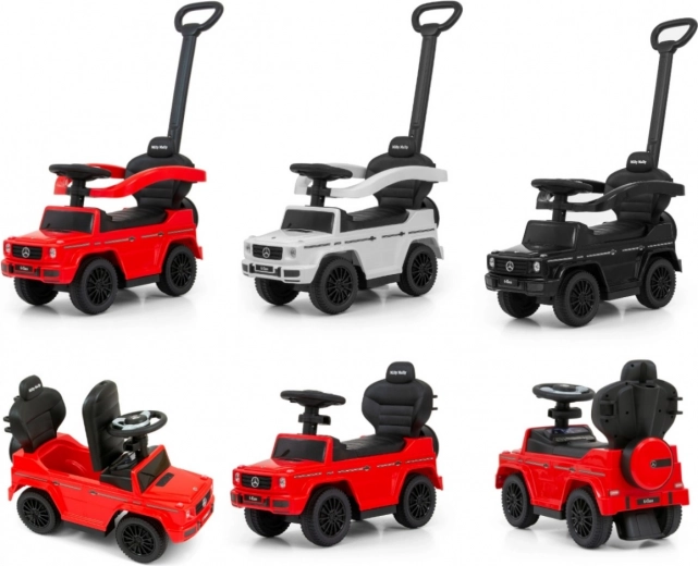 Køretøjet MERCEDES G350d, licenseret af Mercedes, er fremstillet med stor fokus på selv de mindste detaljer og kvaliteten af de anvendte materialer. Takket være legetøjets multifunktionelle karakter går dit barn ikke hurtigt træt af det og udvikler gennem legen sine manuelle færdigheder og motoriske evner. En yderligere fordel er det interaktive rat, som gør legen endnu sjovere. Produktet har styrehjul med rat eller skubbestang, hvilket sikrer behagelig kørsel under gåture. Det er meget let at montere og afmontere, er stabilt og sikkert. De enkelte elementer (gelænder og håndtag) kan afmonteres, så køretøjet “vokser” med dit barn.