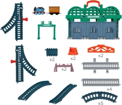 Oplev den travle Knapford Station med det bærbare THOMAS & FRIENDS skinnesæt. Tryk på taget af personvognen, og passagererne ”stiger på”, mens lokomotivet THOMAS kører på plastskinnerne. 26 dele, nem opbevaring og et praktisk bærehåndtag til leg derhjemme og på farten.