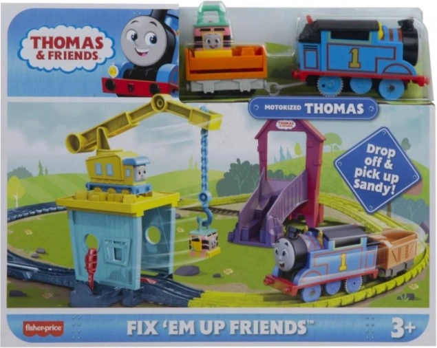Dette farverige batteridrevne sæt med 18 dele giver børn actionfyldt lastning og losning med kranen, kørsel på en rund bane og sjov nedkørsel af vognen Sandy på rutsjebanen. Den motoriserede Thomas trækker en godsvogn, mens kranen Carlys drejelige bom med krog nemt griber og flytter lasten.