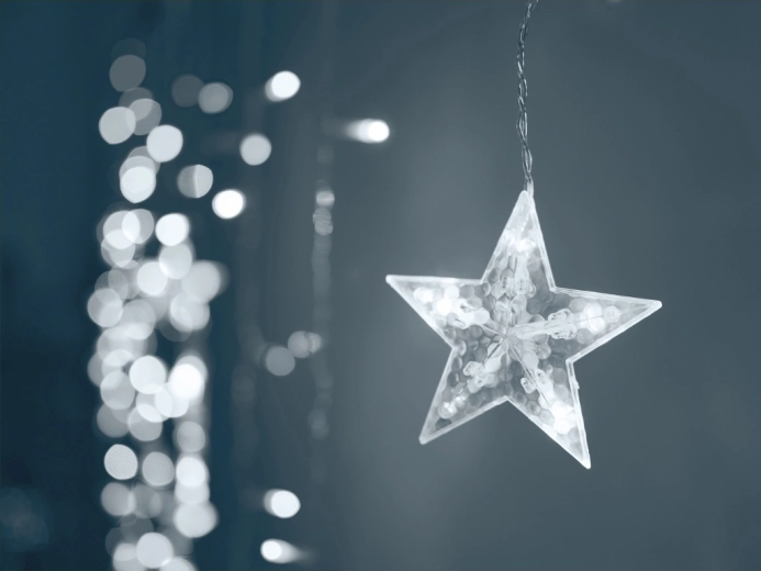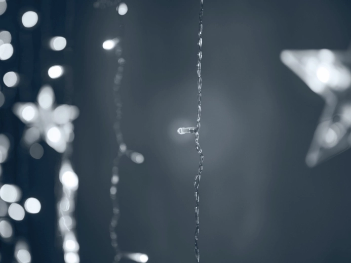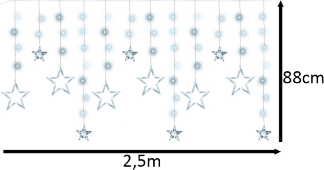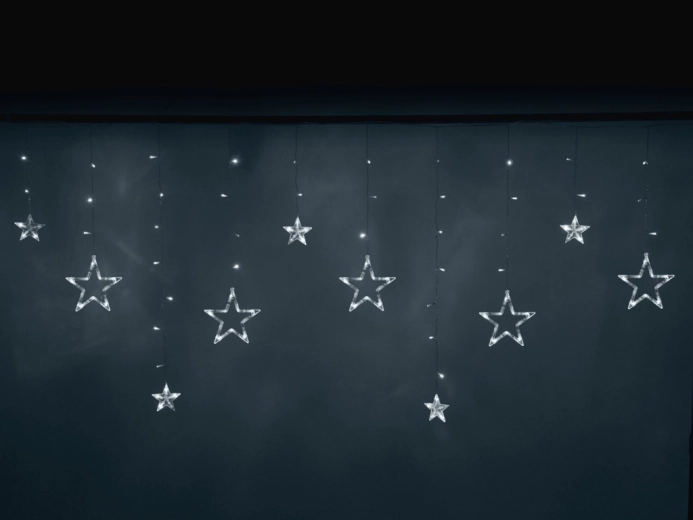 Dette lysgardin med gennemsigtige stjerner i forskellige størrelser oplyser vinduer, vægge og fotohjørner. Den kolde hvide farve skaber et rent, festligt udtryk og et blidt lys, som er ideelt til julepynt, børneværelset og romantiske aftener.