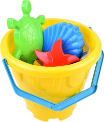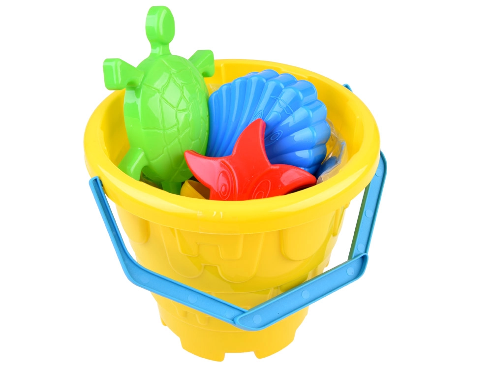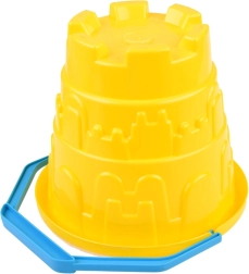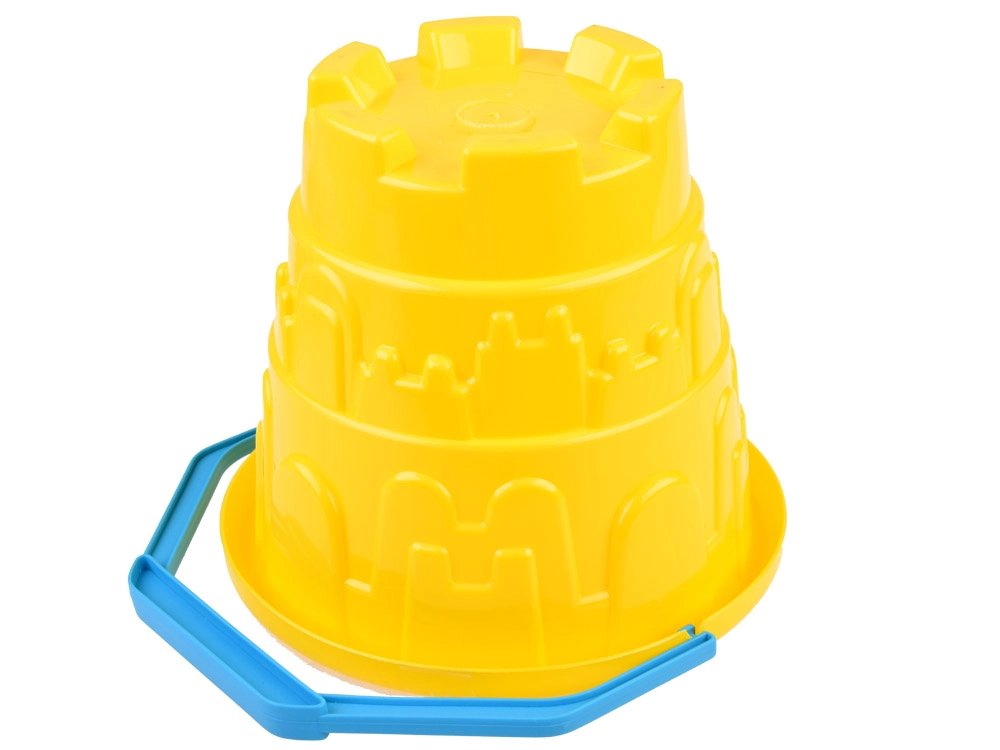 Den plastiske spand med blå hank og forme indeni gør det nemt at tage med på stranden eller i haven.