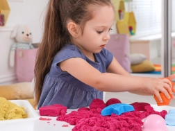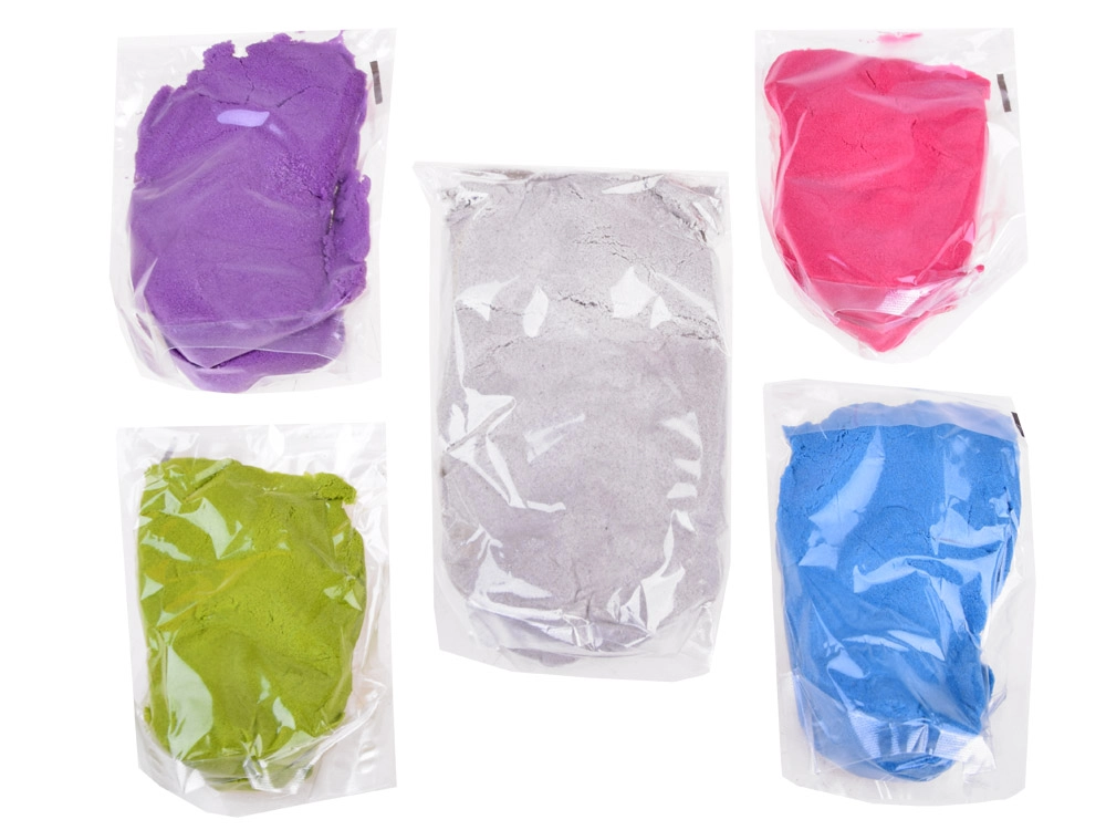 Med fem farvede sandtyper – pink, lilla, grøn, blå og natur – får dit barn timevis af kreativ leg.