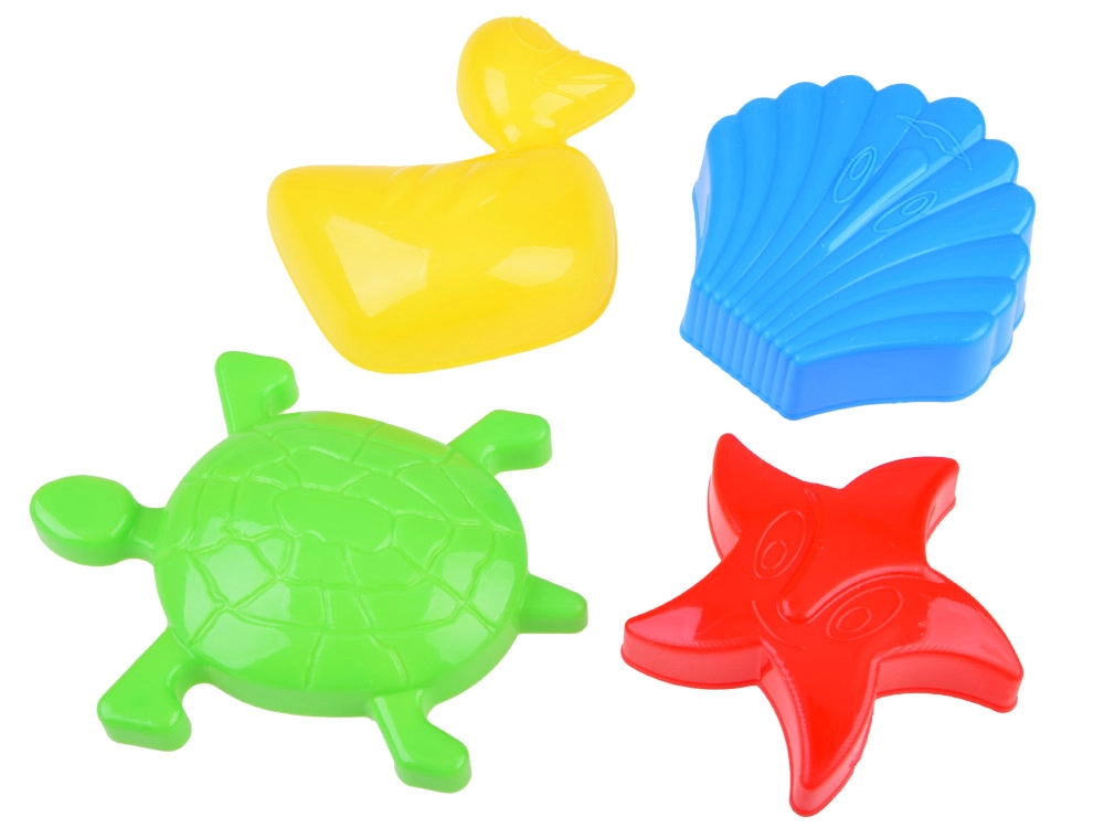 Fire plastforme i form af en and, en musling, en skildpadde og en stjerne gør det nemt og sjovt at forme det dynamiske sand.
