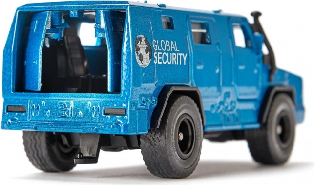 Denne blå sikkerhedstransportør i målestok til børneleg udmærker sig ved robust metaludførelse og autentiske karrosseridetaljer – grill, forlygter, håndtag og panelprægninger. Takket være de frit roterende hjul er den klar til dynamisk kørsel på gulvet og på racerbaner. De åbnebare elementer afslører interiør med sæder samt lastrum til “værdifuld last”.