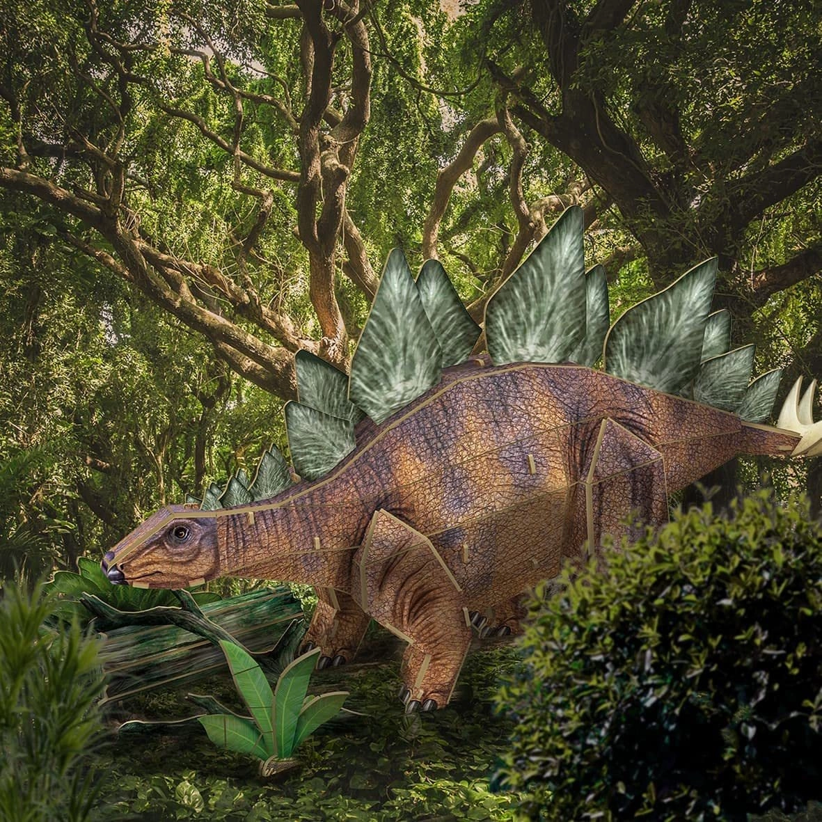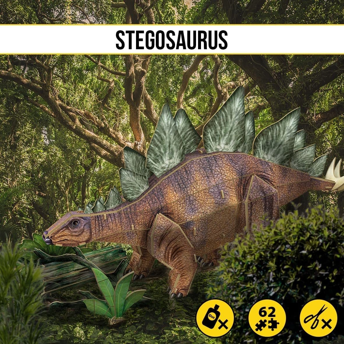 Sæt med 3D-puslespil med dinosaurer. Model af en stegosaurus, der består af 62 dele. Disse 3D-dinosaurpuslespil er lavet af forudstanset papir og skumkarton, som er sikrere end metal og træ, mere realistisk og lettere end plast. En illustreret vejledning gør det muligt for små bygmestre at samle modellerne selv.