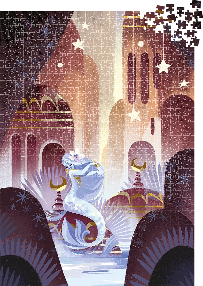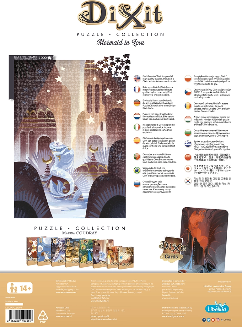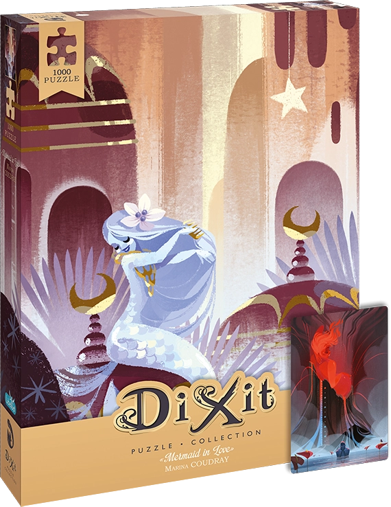 Træd ind i DIXITs drømmeverden og oplev de ikoniske illustrationer som et premium puslespil. Motivet Forelsket havfrue af illustratoren Marina Coudray udmærker sig ved blide farver og fantasi, der stimulerer forestillingsevnen både under samling og i spillet.