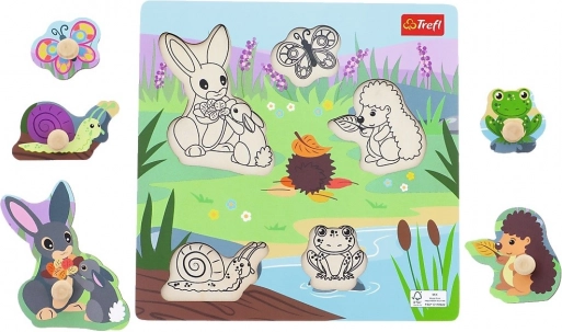 Træindsætningspuslespil Dyr på engen, 5 brikker med greb. Farverig grafik, sort-hvid skabelon, udvikler finmotorik. Velegnet fra 18 måneder.