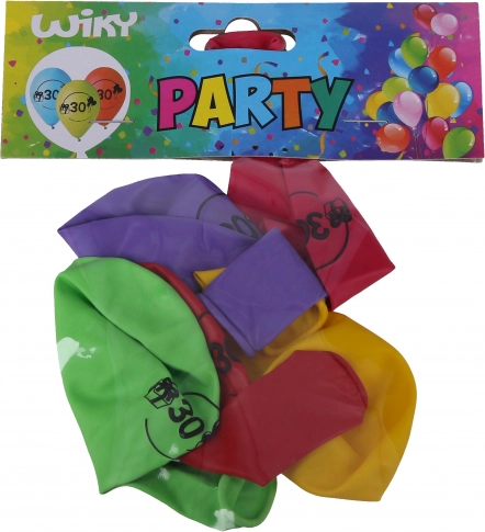 Sæt med 5 latexballoner, 30 cm, i farvemix med tallet 30. Ideel dekoration til 30-års fødselsdag eller jubilæum. Kan pustes op med luft eller helium.