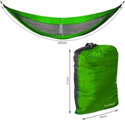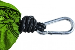 Hængekøjen er udstyret med en praktisk bærepose, der gør den let at transportere - den foldede hængekøje optager minimal plads og passer ind i en lille rygsæk. Når den er foldet ud, kan posen bruges som en lomme til drikkevarer, telefon eller aviser.