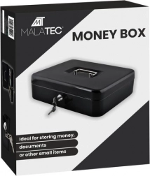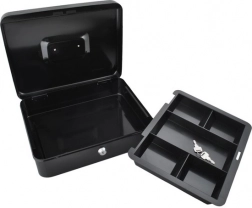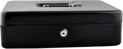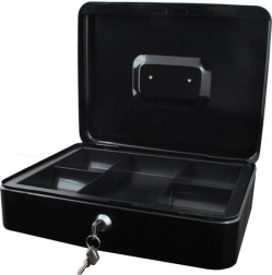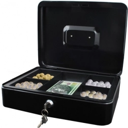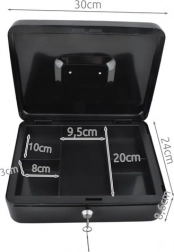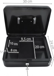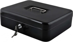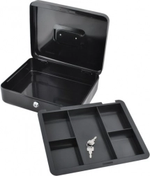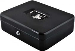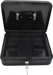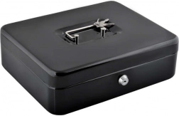Denne store metal-kontantboks i elegant sort forener sikkerhed, overblik og holdbarhed. Den lakerede stålkappe og de solide indvendige hængsler beskytter indholdet mod skader og uautoriseret adgang, mens nøglelåsen (2 nøgler medfølger) giver tryg låsning.