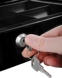 Den indvendige plastindsats med rum holder mønter og sedler overskueligt organiseret for hurtigere arbejde ved kassen.