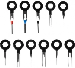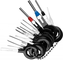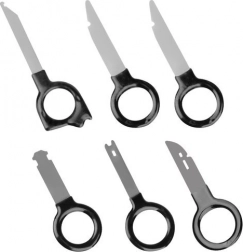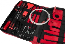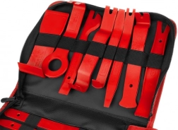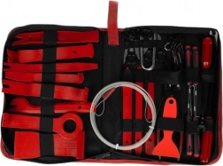 Alt, hvad du behøver til afmontering af interiøret: 12 plast-afmonteringsværktøjer, clips-tænger, 2 clip-aftrækkere (22,5 og 31 cm), 8 nøgler til radio, 11 pin-nøgler og 4 kroge. Overskueligt opbevaret i et slidstærkt etui med lynlås.