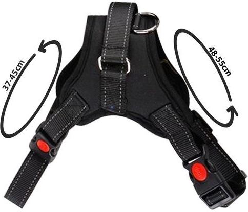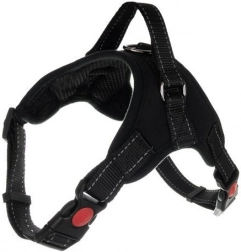 Selen justeres nemt omkring både hals og bryst. Hurtigudløselige spænder med lås sikrer en pålidelig lukning, mens reflekterende syninger øger synligheden i tusmørke. Det praktiske øverste håndtag hjælper med at kontrollere hunden i krævende situationer, og den metal D-ring giver sikker fastgørelse af snoren.
