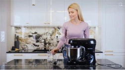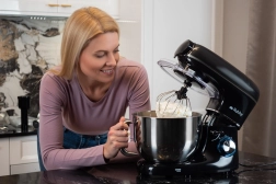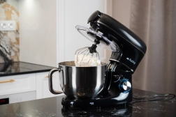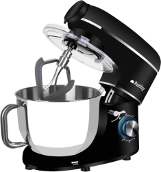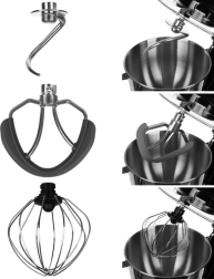 I pakken finder du tre værktøjer: dejkrog, ballonpiskeris og blander med silikoneskrabere for perfekt sammenføring af ingredienser. Den stabile base med skridsikre sugekopper, sikkerhedslås og LED-belyst drejeknap gør maskinen til en pålidelig partner til bagning og daglig madlavning.