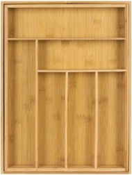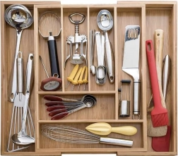 Få styr på bestik, knive og køkkenredskaber med den tidløse bambusorganizer RUHHY. Med de udtrækkelige sider får du en variabel inddeling med 6–8 rum, der nemt tilpasses både indhold og skuffebredde. Det naturlige materiale udmærker sig ved holdbarhed, hurtig tørring og en æstetisk fremtoning, der passer ind i ethvert moderne køkken.