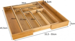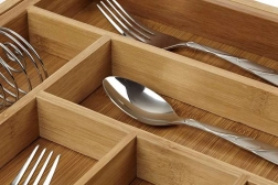 Organizeren er designet til at holde tingene overskueligt på deres plads og samtidig gøre hverdagsbrug nemmere. Den glatte bambusoverflade mindsker ophobning af snavs og gør det let at vedligeholde under rindende vand. Den praktiske højde og ruminddeling sikrer bekvem opbevaring af skeer, gafler, knive og småt tilbehør.