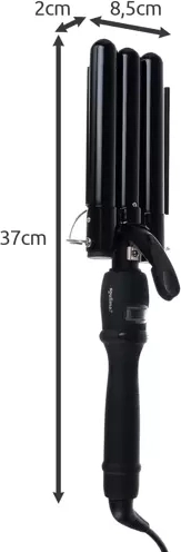 Dette tredobbelte bølgejern med 22 mm tromlediameter skaber ensartede, naturlige bølger på ingen tid – indsæt en hårlok, klem og flyt videre. Keramisk PTC-varmelegeme sikrer hurtig og jævn opvarmning samt skånsom kontakt med hårfiberen uden unødig overophedning.