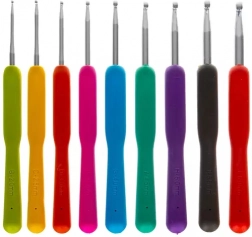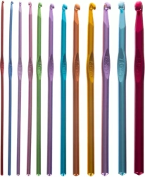 Sættet indeholder 21 farvede hæklenåle i forskellige størrelser med ergonomisk design for nem og komfortabel brug.