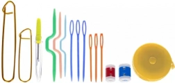 Sættet inkluderer ikke kun nåle, men også sakse, lineal og andre værktøjer der er nødvendige for hækling.