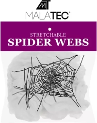Skab på et øjeblik en uhyggelig atmosfære med det kunstige spindelvæv fra MALATEC og 2 edderkopper i pakken. De tætte, elastiske fibre er lette at trække ud og dækker et areal på op til 2,5 m². Ideelt til Halloween-udsmykning i hus, lejlighed og til fester – nem montering, realistisk effekt og alsidig brug både inde og ude.