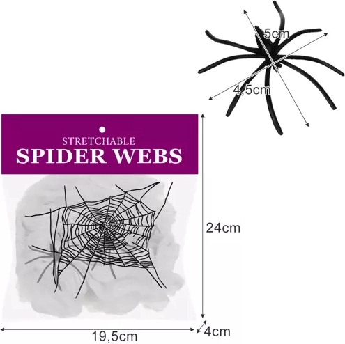 Pakken indeholder 2 sorte edderkopper for en endnu mere markant effekt. Dekorationen er egnet til temafester, boligpynt og virksomhedsevents. Installationen er hurtig og enkel – træk blot spindelvævet ud mellem de valgte steder og tilføj edderkopperne.