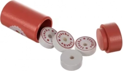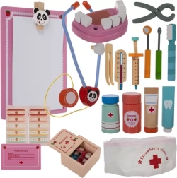 Med følger også en tandmodel med udtagelige tænder til træning af korrekt tandhygiejne, stetoskop, termometer, injektionssprøjte, “medicin” og andre tilbehør. Træudførelsen er tidløs, holdbar og behagelig – perfekt til daglig leg.