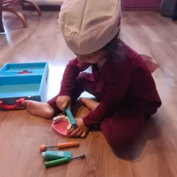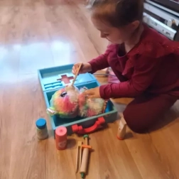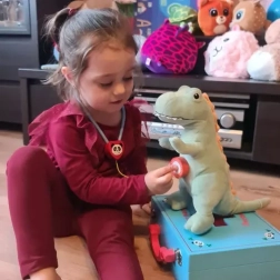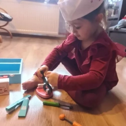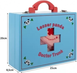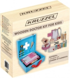 Dette komplette læge- og tandlægesæt i en solid trækuffert giver børn realistiske redskaber til at øve undersøgelser og tandpleje. Takket være den praktiske organisering og det brede udvalg af værktøjer lærer børn naturligt at genkende former, farver og sundhedsprocedurer gennem leg.