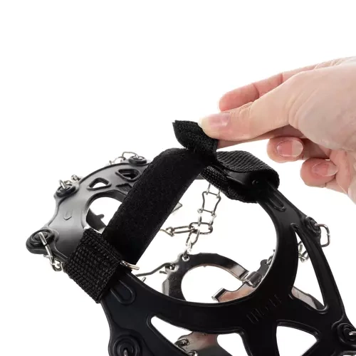 SKRIDSIKKERHED + REMME – elastiske overtræk til sko, udstyret med stålpigge. De er ideelle til vandrere, skov- og bjergture. Ved at tage dem på kan vi klare os under vanskelige vejrforhold som sne og is. Derudover forhindrer velcrobånd, at pigkæderne glider af skoene.