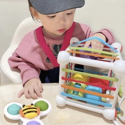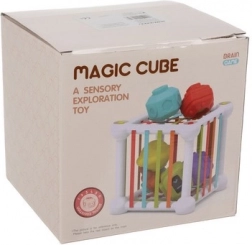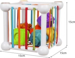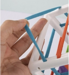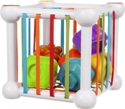 Denne lærende legeting kombinerer formsortering, sanse-stimulering og træning af finmotorik. Børn trækker delene gennem farvede gummibånd, sætter dem i og tager dem ud, ryster dem som rangler og opdager nye teksturer, farver og former. Terningen er let, holdbar og sikker – fremstillet af kvalitets-ABS uden BPA med afrundede kanter.