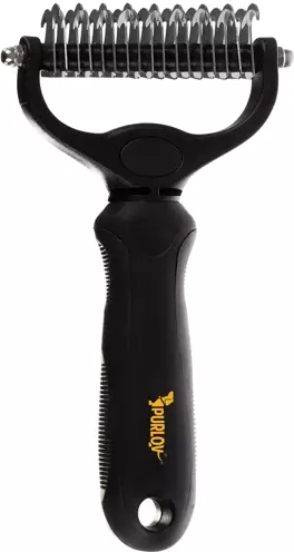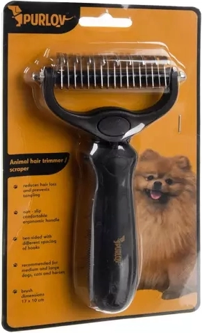 Den universelle dobbeltsidede pelstrimmer og pelsrive PURLOV til hunde og katte kombinerer en side med 17 finere tænder og en side med 9 bredere tænder til både tæt underuld og fin pels. Reducerer effektivt fældning, udreder nemt filtre og underuld og er behagelig at bruge takket være det ergonomiske, skridsikre håndtag. Afrundede tandspidser er skånsomme mod huden.