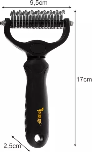 Leder du efter en effektiv løsning mod hår på tøj og møbler? Den dobbeltsidede trimmer og pelsrive PURLOV er designet til hurtig og skånsom udredning af både hunde og katte. To tandafstande (17 og 9) klarer alle pelstyper – fra tæt underuld til finere hår. De indvendige, slebne kanter skærer blødt gennem filtre, mens de afrundede ender beskytter dit kæledyrs hud.