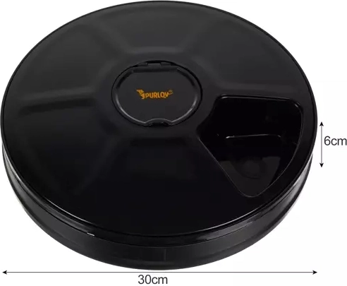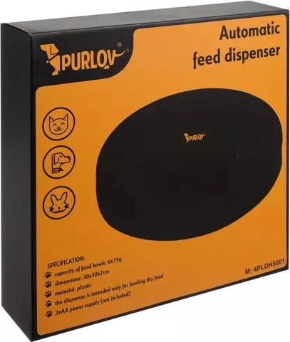 Den automatiske PURLOY foderautomat er en pålidelig løsning til regelmæssige måltider, også når du ikke er hjemme. Den roterende tallerken med seks rum frigiver forberedte portioner i præcist indstillede tider. Det klare LED‑display og den enkle betjening gør det hurtigt at sætte fodringsplanen for hunde, katte og smådyr.