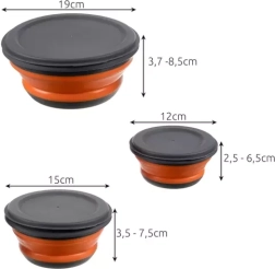 Sættet inkluderer skåle med 0,4 l, 0,85 l og 1,65 l kapacitet, hvilket dækker forskellige behov for madopbevaring. Det foldbare design gør det nemt at opbevare.