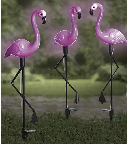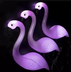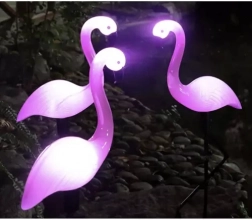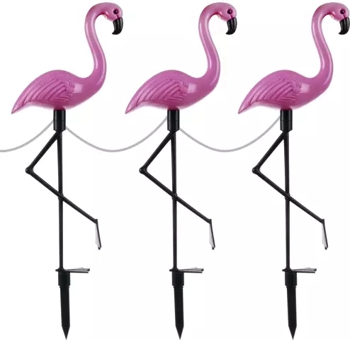 I pakken modtager du tre lys i form af flamingoer, forbundet til et solpanel og udstyret med LED-dioder for blid belysning.