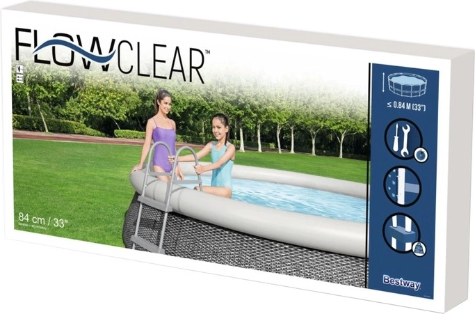 BESTWAY Flowclear stige til pools op til 84 cm i højde er designet til maksimal sikkerhed og komfort. Den stabile metalramme med antikorrosionsbehandling og solide plasttrin sikrer et sikkert skridt ved hver ind- og udstigning. Ideel løsning til havepools, børn og seniorer.