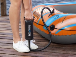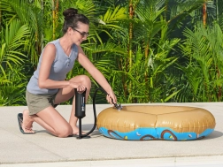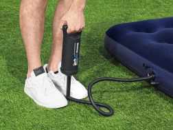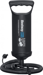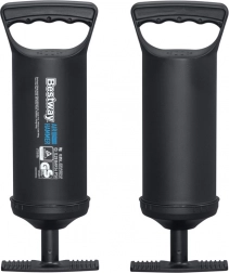 Kompakt manuel stempelpumpe fra Bestway til hurtig oppustning af madrasser, pools, både og legetøj. Den tilbyder kontinuerlig luftgennemstrømning ved både op- og nedadgående bevægelse, en lang fleksibel slange og 3 universelle mundstykker til forskellige ventiler. Perfekt til rejser – let, robust og pladsbesparende.