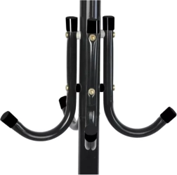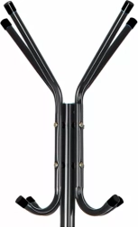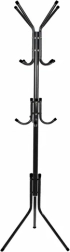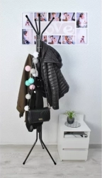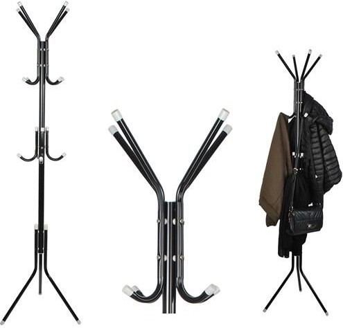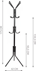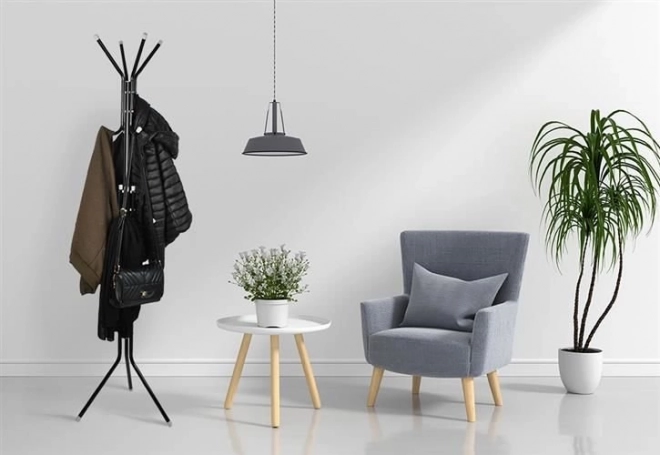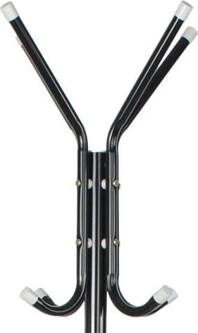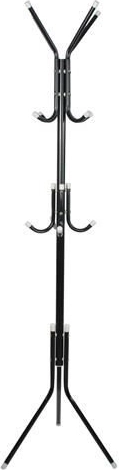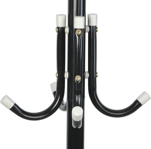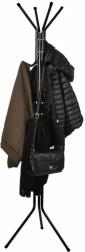 Med dette stilfulde sorte metalstativ holder du nemt orden. Det er udstyret med tre niveauer af kroge, som gør det muligt at hænge forskellige typer tøj og tilbehør op. Stabiliteten og holdbarheden sikrer, at stativet står fast, selv ved brug med store mængder tøj.
