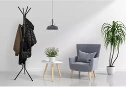 Elegant og funktionel sort fritstående metalgarderobestativ er ideel til at organisere pladsen i dit hjem eller på kontoret. Den stabile konstruktion med tolv kroge sikrer rigelig plads til ophængning af tøj og tilbehør.