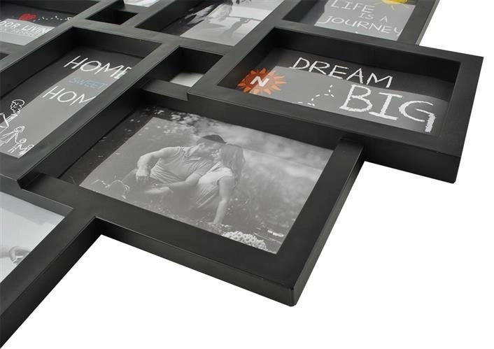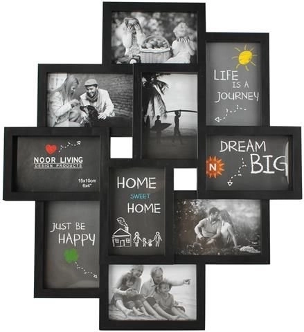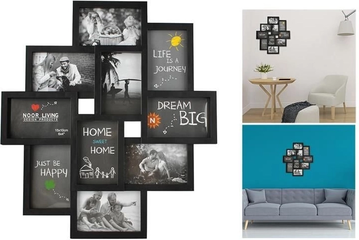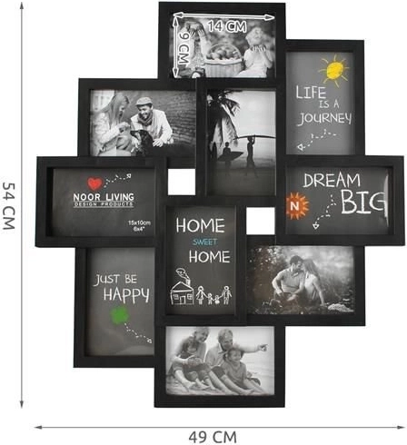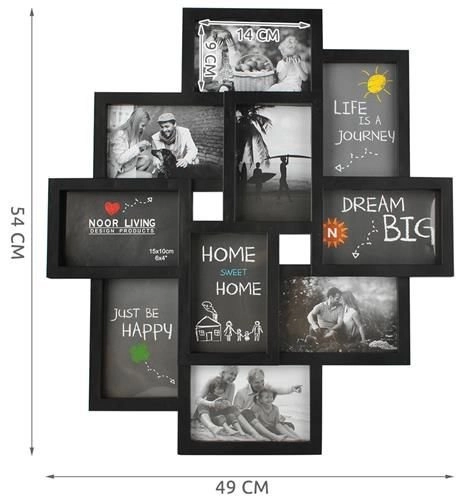Stilfuld multiramme til op til 10 fotos i størrelsen 10×15 cm (synligt område 9×14 cm) i elegant sort. En fantastisk måde at samle dine yndlingsminder på, med attraktiv collageeffekt, sikker foliebeskyttelse i stedet for glas og nem montering på væggen eller op ad en væg.