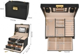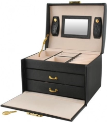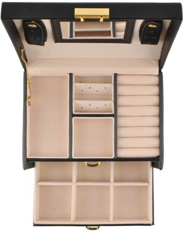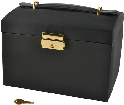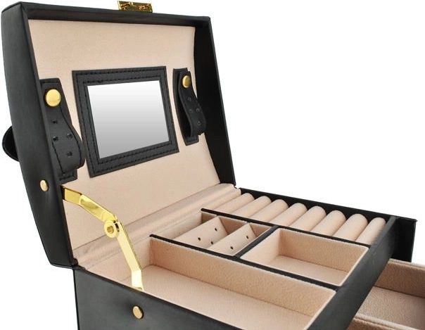 Sort PU-læder med gyldne accenter og et praktisk spejl i låget forener stil og funktionalitet i den daglige smykkepleje.