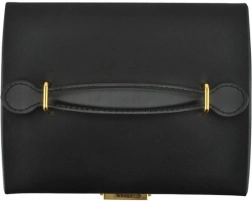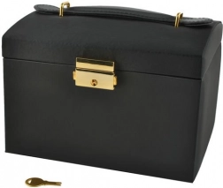 Det indvendige for i blødt materiale skåner smykkernes overflader mod ridser. Smykkeskrinet er let at tage med takket være det praktiske håndtag, og de kompakte mål gør det velegnet både på sminkebordet og i skuffen. Den tidløse sorte farve og gyldne accenter fremhæver et elegant interiør.