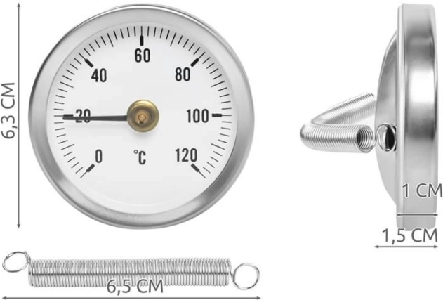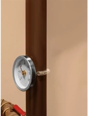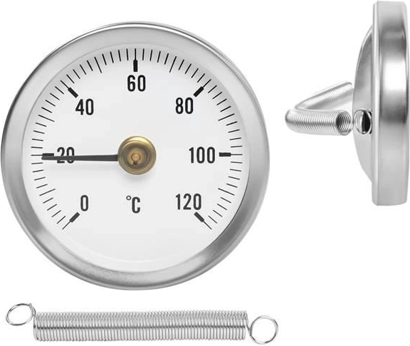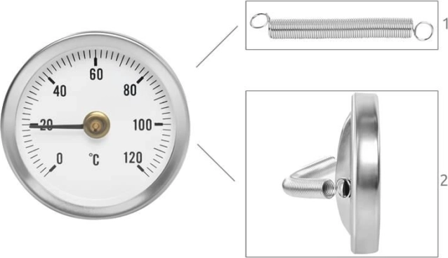 Montering er enkel ved hjælp af den medfølgende fjeder, som tilpasser sig standard rørdimensioner. Den bimetalliske konstruktion udnytter metaller med forskellig udvidelse til at bevæge viseren, hvilket garanterer præcise og stabile resultater.