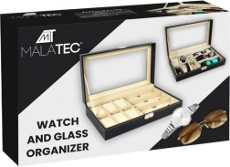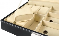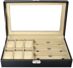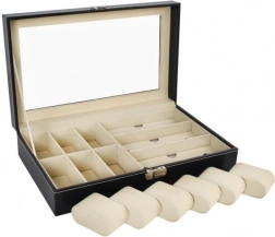 Den elegante sorte organizer med hvid stikning kombinerer et repræsentativt udseende og praktisk funktion. Det glasdækkede låg giver en overskuelig præsentation af indholdet, mens adskilte rum med blød foring beskytter ure, briller og andre smykker mod ridser og uønsket kontakt.
