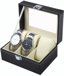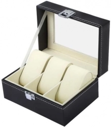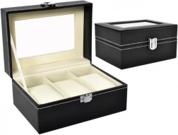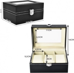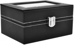 Organisér og beskyt dine ure og smykker i en elegant boks, der kombinerer premium look og praktisk beskyttelse. Det sorte økolæder med kontrasterende hvid syning giver et tidløst udtryk, mens glaslåget giver øjeblikkeligt overblik og en effektfuld udstilling.